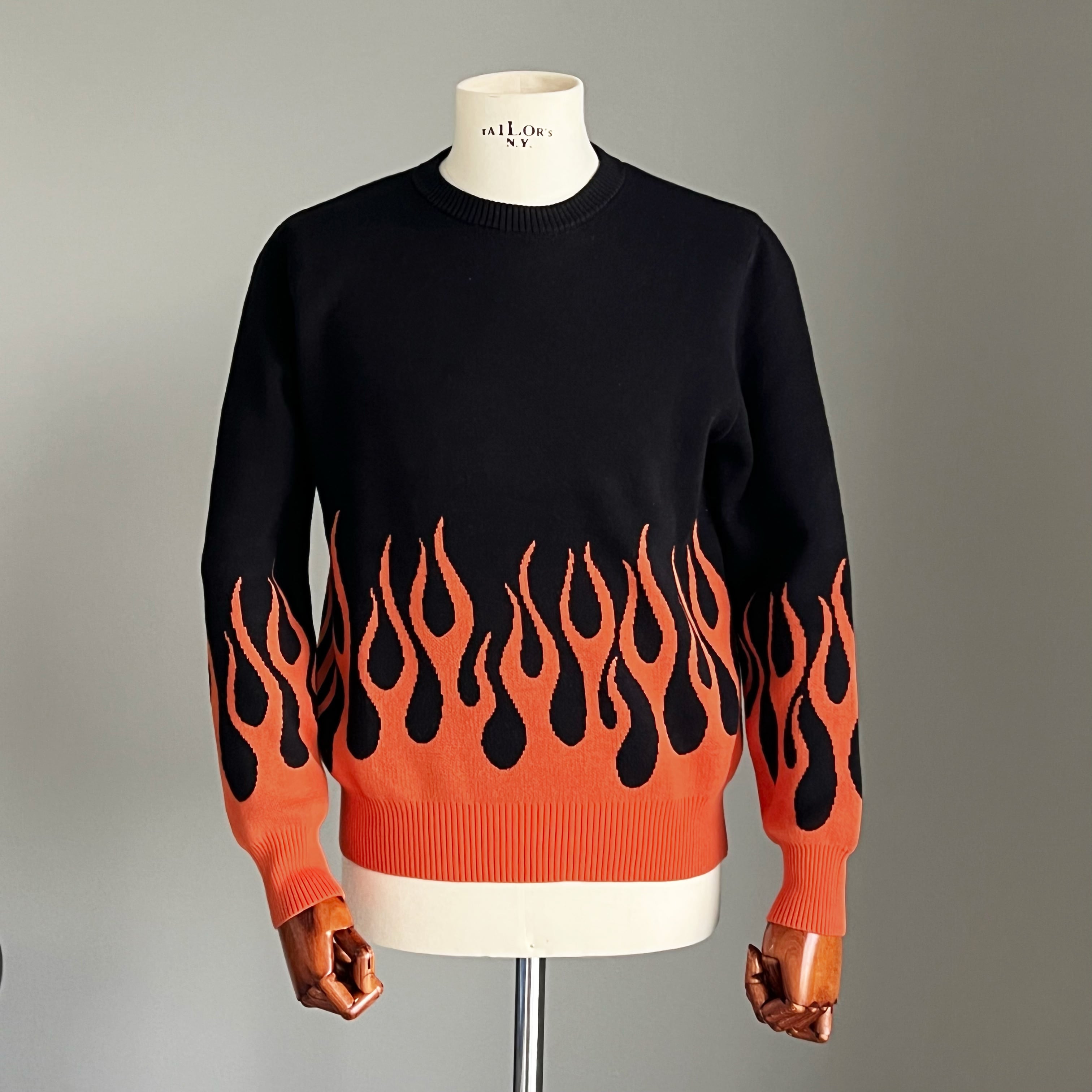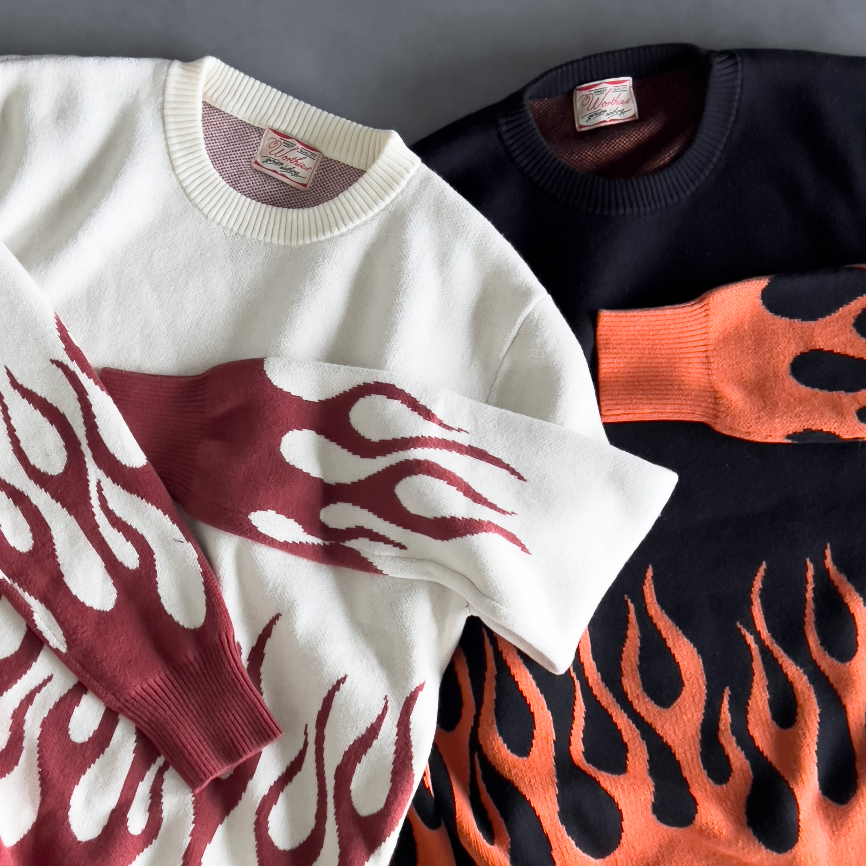 フレイムパターンを大胆に編み込んだツートーンカラーが印象的なコットン100%のオリジナルニットセーター。