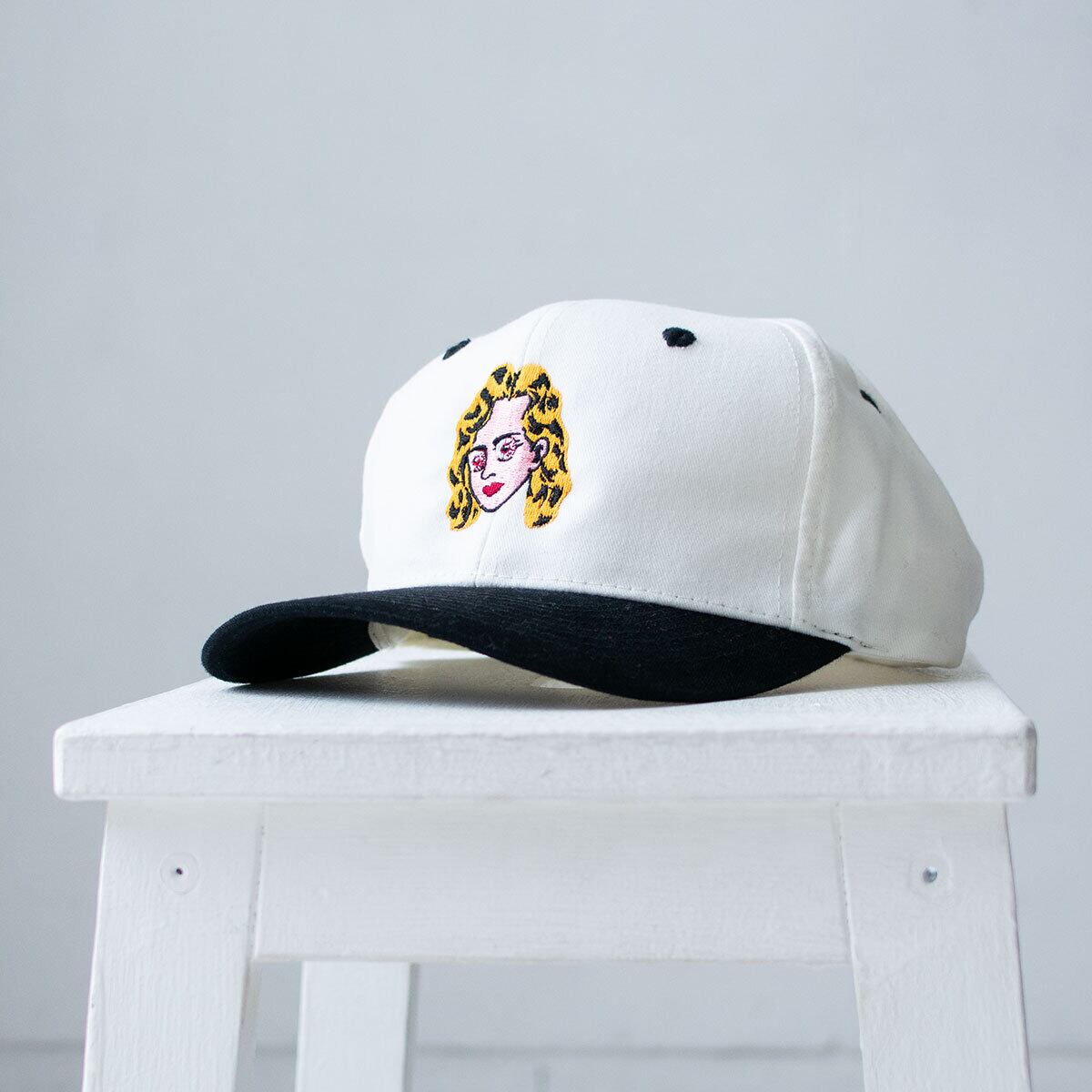 アメコミテイストのユニークな目玉ガールが刺繍されたツートーンの6パネルベースボールキャップ。